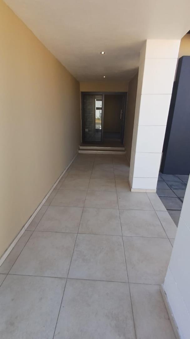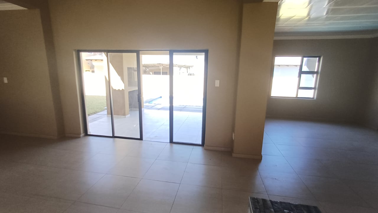 The patio with a built-in braai facing the pool area.