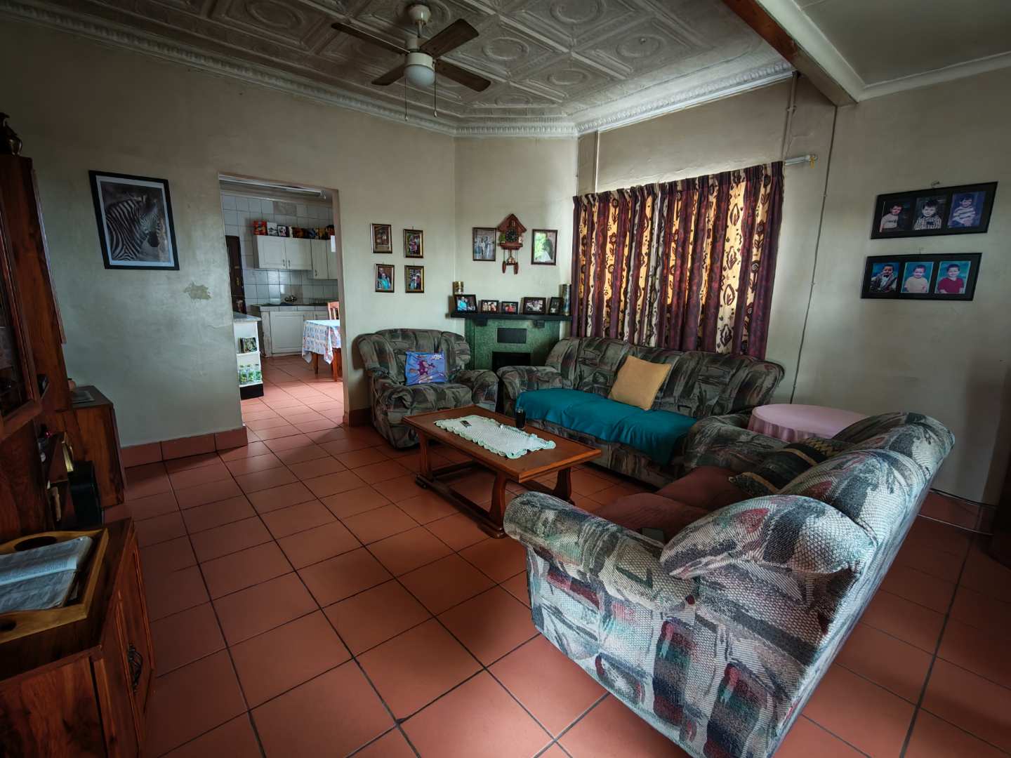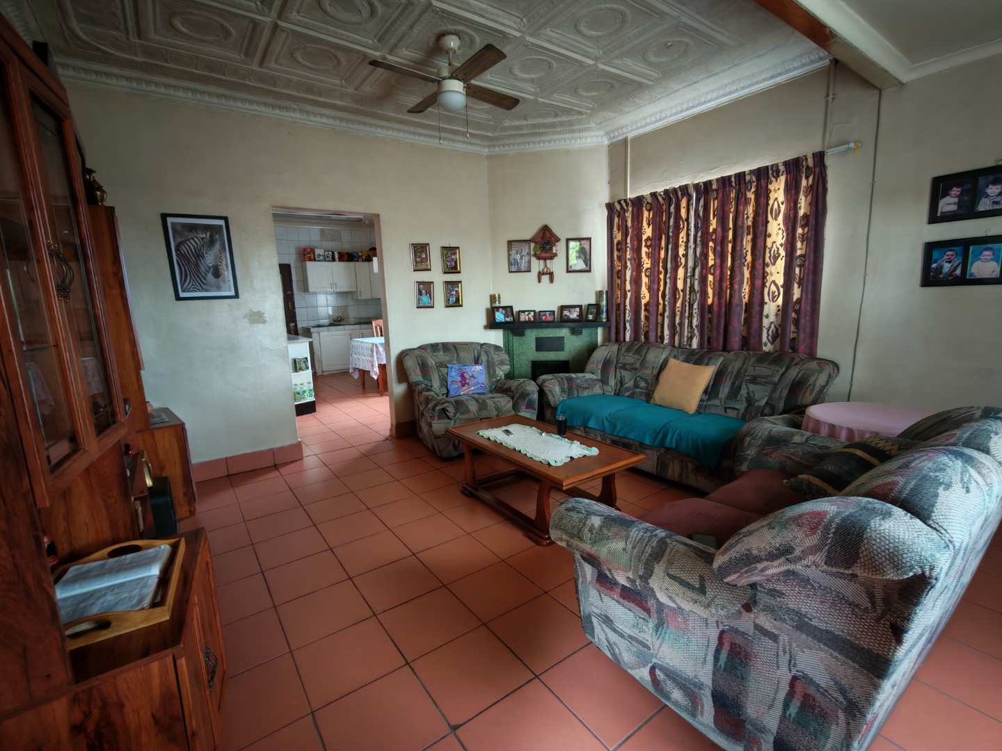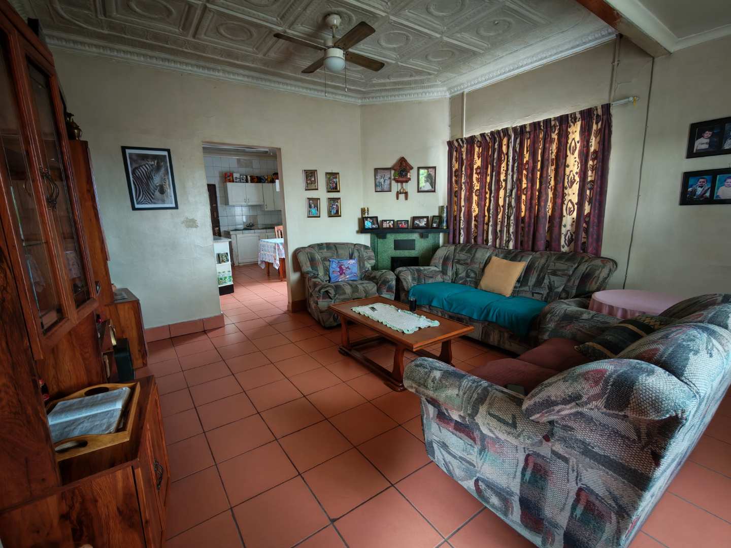 As you enter from the patio, you are welcomed into a cozy lounge area featuring a fireplace. The lounge flows into a spacious kitchen fitted with a basin, stove, and oven, with enough room to accommodate a dining area.