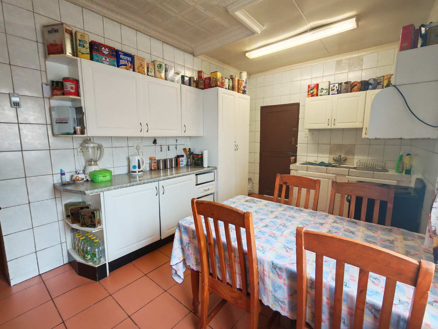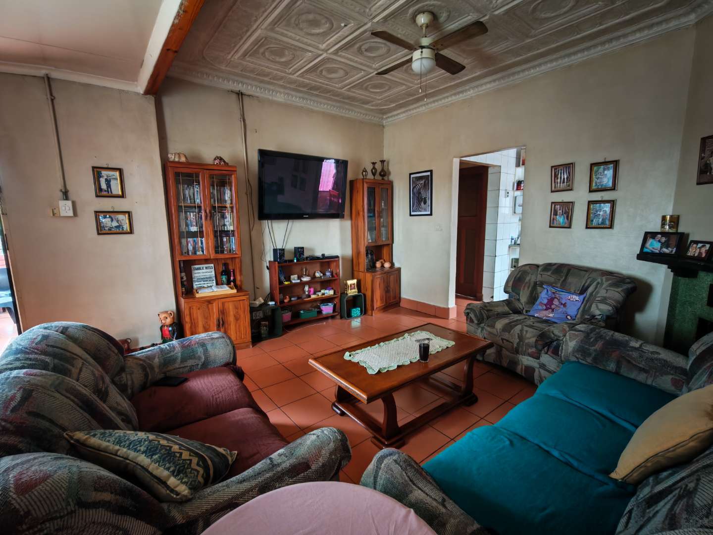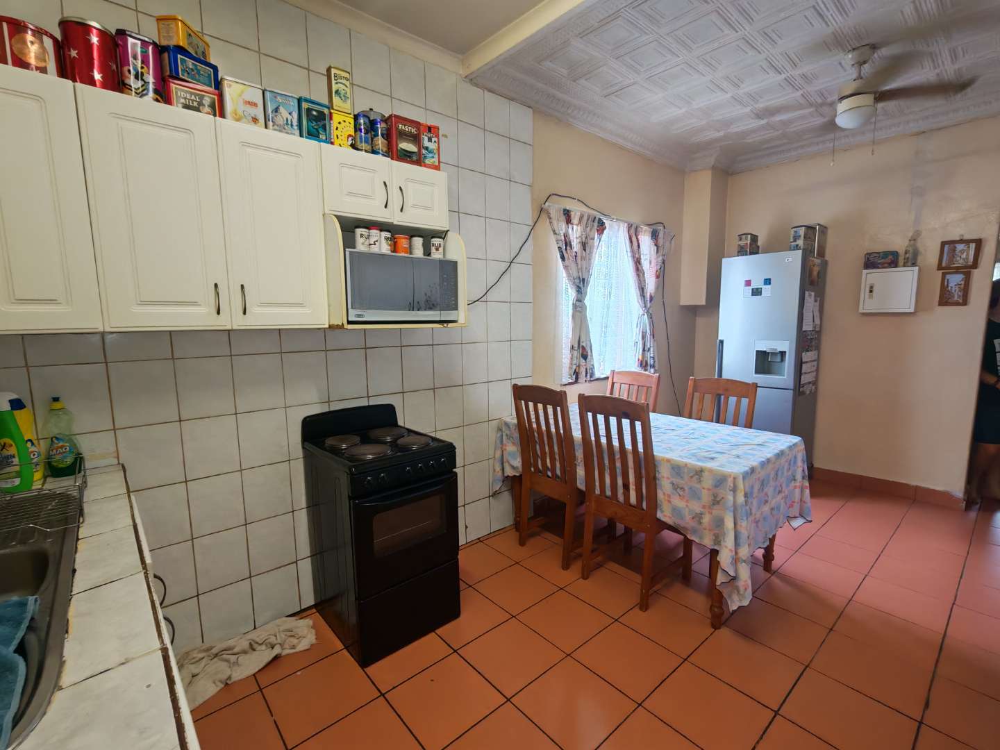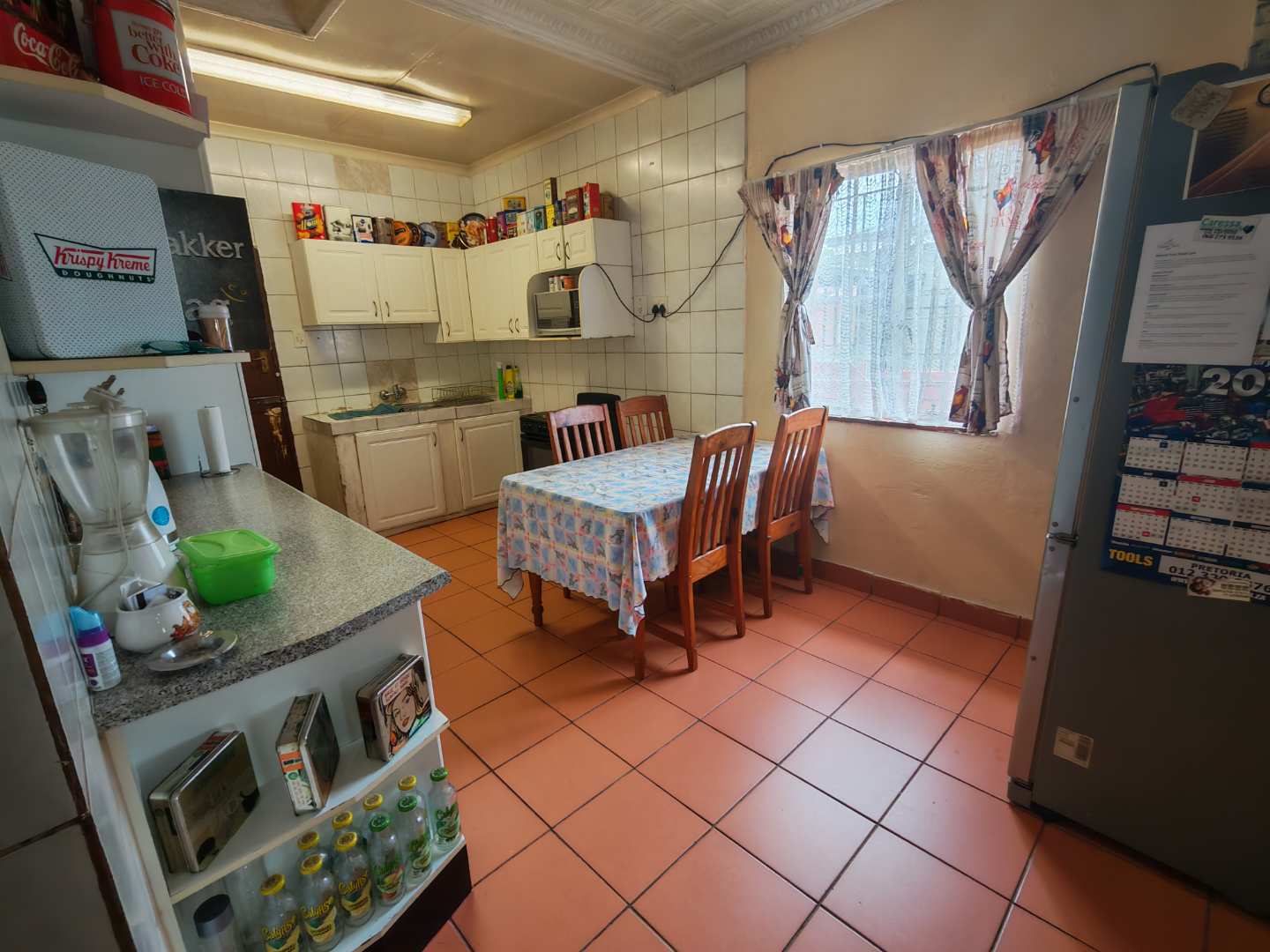 As you enter from the patio, you are welcomed into a cozy lounge area featuring a fireplace. The lounge flows into a spacious kitchen fitted with a basin, stove, and oven, with enough room to accommodate a dining area.