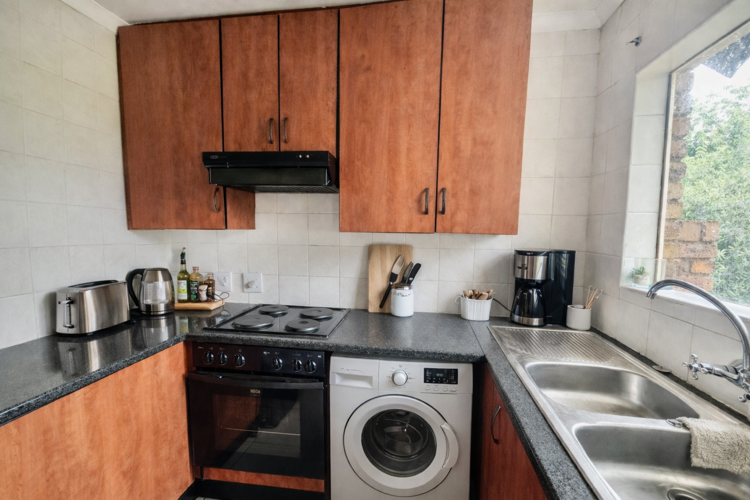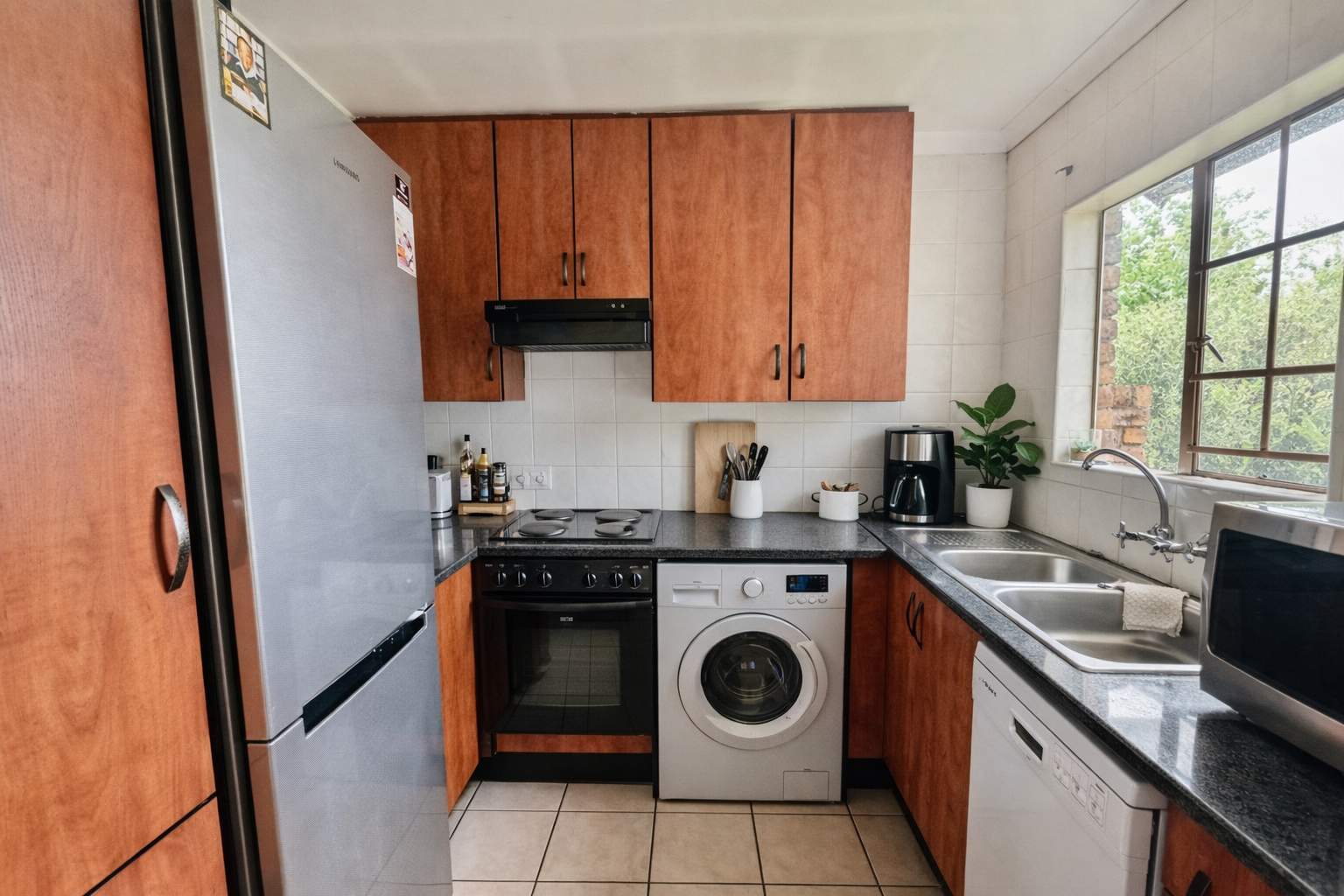 The kitchen is generously sized and fitted with cherry wood cupboards and granite countertops, offering both style and practicality. It also includes dedicated space for both a washing machine and dishwasher, flowing seamlessly into a dining area for easy everyday living.